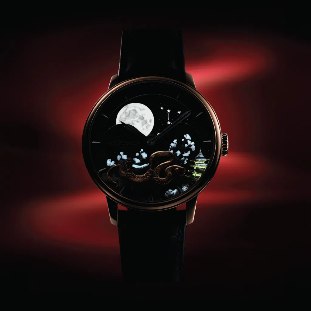 Arnold & Son celebrates the Chinese zodiac calendar with Perpetual Moon 41.5 “Year of the Snake.” Under this element, the reptile foretells transformation and a need for self-improvement, combined with energy and introspection. It is a year of negotiations, shrouded in mystery and secrecy.