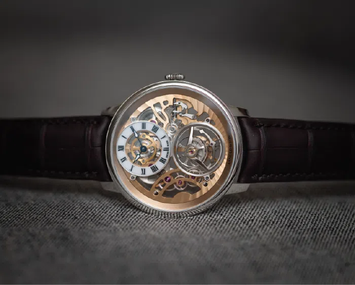 A skeletonized movement can convey a mood or a message – chaotic, orderly, geometric, or minimal. Here, elegance is the watchword. The curvilinear skeletonized caliber reveals pronounced arcs and numerous inflection points highlighted by an original finish. On both the Ultrathin Tourbillon Skeleton Red Gold and Platinum, the bridges are decorated with radiating Côtes de Genève stripes and treated with rose-gold PVD (4N).