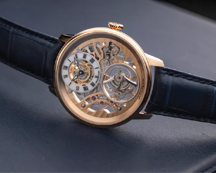 The new Arnold & Son Ultrathin Tourbillon Skeleton is defined by its ultra-slim profile and its graceful curves and wide apertures. Its new case, with a diameter of 41.5 mm and a thickness of 8.4 mm, presents the flying tourbillon caliber A&S8320 in its purest expression.