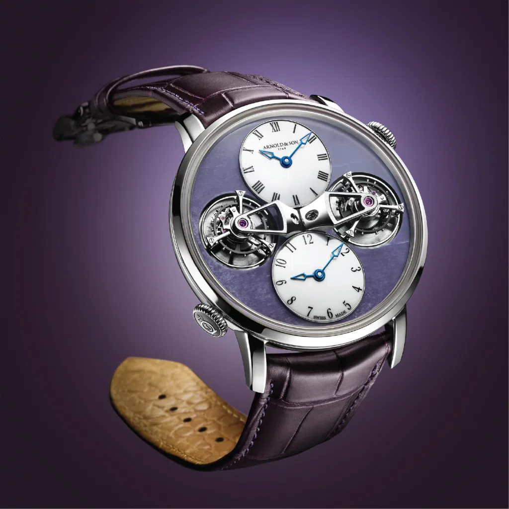 In the watchmaking language of Arnold & Son, the double tourbillon is a rare construction, making the eponymous collection a fitting vehicle for unique pieces. Double Tourbillon White Gold draws on the richness of the natural materials that Arnold & Son explores with method and originality. Charoite is the newest member of the Double Tourbillon White Gold mineral dial timepieces – following the Swiss manufacturer’s imperial jade, malachite, and Baltic amber editions.