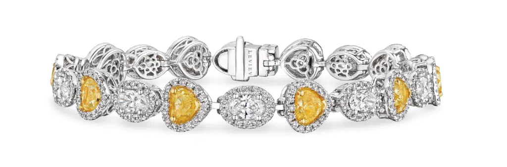 Heart cut and oval diamonds take center stage in this enchanting Leviev Heart Shaped Fancy Yellow Diamond Bracelet. An endearing piece that captures the romantic essence of Valentine’s Day, this bracelet spotlights fancy yellow diamonds in a heart shape, totaling a 5.42 carats.