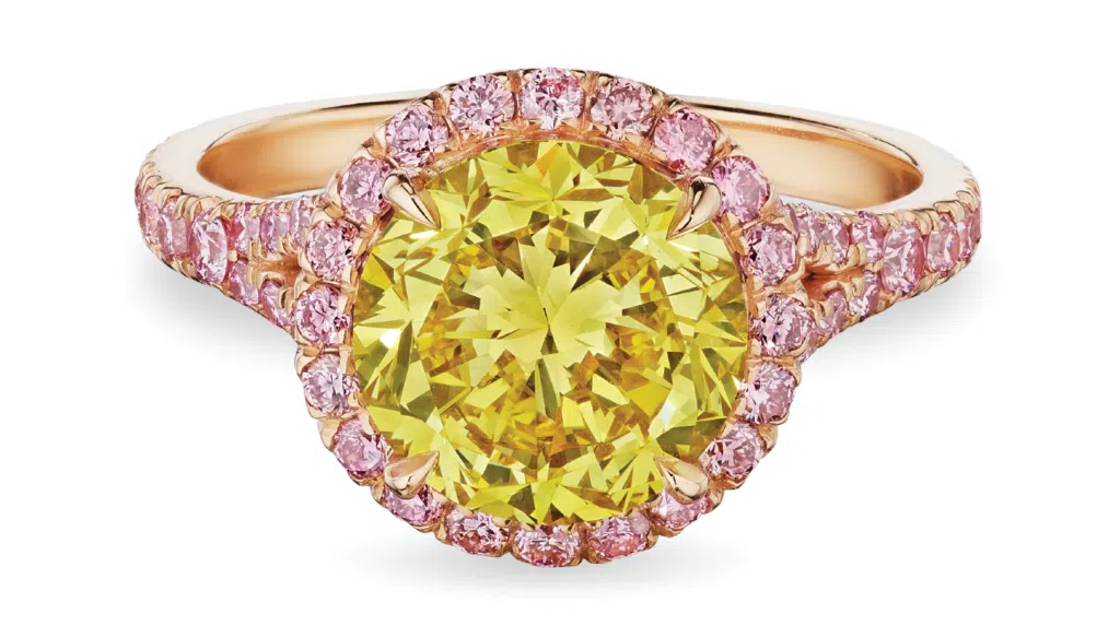 A study in vibrant color, this vibrant Leviev ring makes a fitting Valentine’s Day to celebrate the light of love in sunny yellow and pink diamonds.