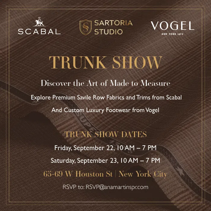 Style is made to measure this fall as Sartoria Studio hosts a special two-day trunk show event with Vogel and Scabal that celebrates the best of custom men’s tailoring and made-to-measure footwear.