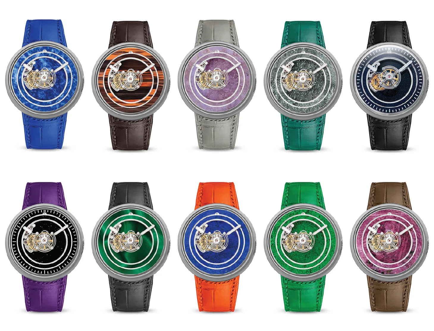 The dials of the KS 05 collection are crafted from a variety of natural stones. Watch enthusiasts will appreciate the diversity of hues and textures presented, from vibrant green Malachite, nuanced, verdant Jade, and Maw Sit Sit, to intense blue of Sodalite and deep, glinting Lapis Lazuli, to the vibrant Ruby and softer shade of Purple Jade.