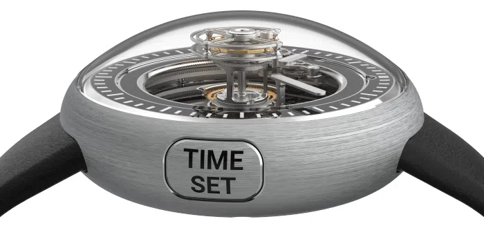 The time display mechanism operates peripherally, working around the barrel and the tourbillon mechanism. The peripheral display orbits 360 degrees around the tourbillon, and the reduction ratio between the hour and minute is achieved through a planetary system mounted on two ceramic ball bearings.