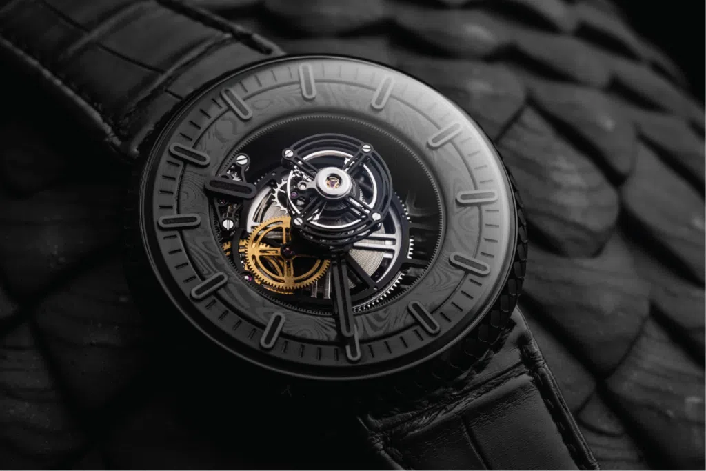 The watch’s design synthesizes key elements of the fantasy series and its renowned dragons, such as its dial, made of Damasteel®. Reminiscent of Valyrian steel, fans will recognize its striated appearance made up of multiple dark and shimmering layers. The Damascus steel used in the Dragon Central Tourbillon dial is crafted by Damasteel, the same foundry that forged the metal used in the HBO series’ swords.