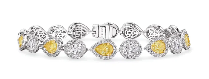 Crafted to perfection, this exclusive Leviev diamond bracelet spotlights pear-shaped fancy yellow diamonds totaling 5.06 carats alternating with a further 4.45 carats of round white diamonds, each encircled by a halo.