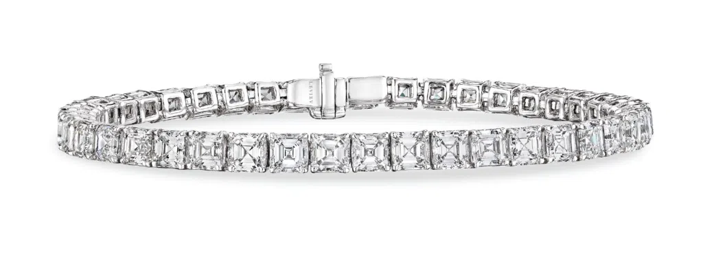 Classic yet astonishing in its beauty and grandeur, this Leviev tennis style bracelet showcases 44 Asscher cut diamonds totaling an extraordinary 10.95 carats set within an 18-karat white gold setting.