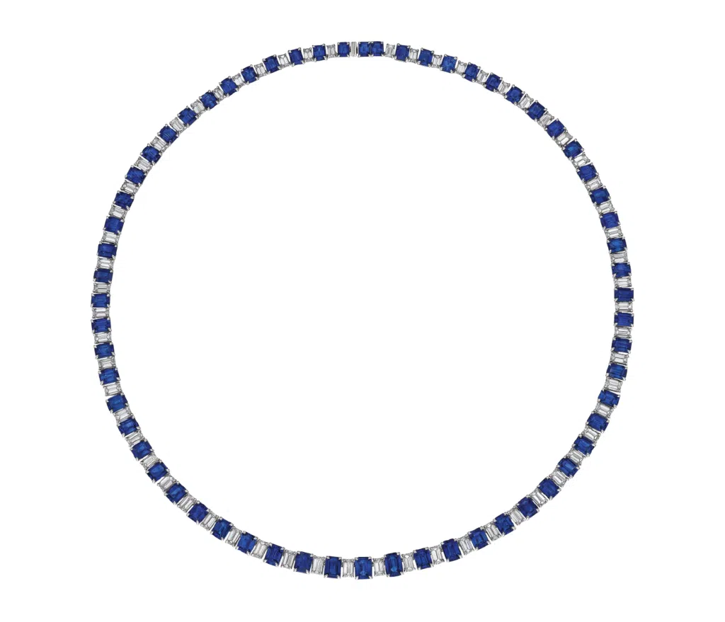 This Leviev Diamond and Sapphire Platinum Necklace makes a captivating and high-quality gift for any mother on Mother’s Day. This remarkable piece, set in polished platinum, highlights a harmonious blend of diamonds and sapphires – with 10.96 total carats in diamonds and 32.24 carats of stunning sapphires.
