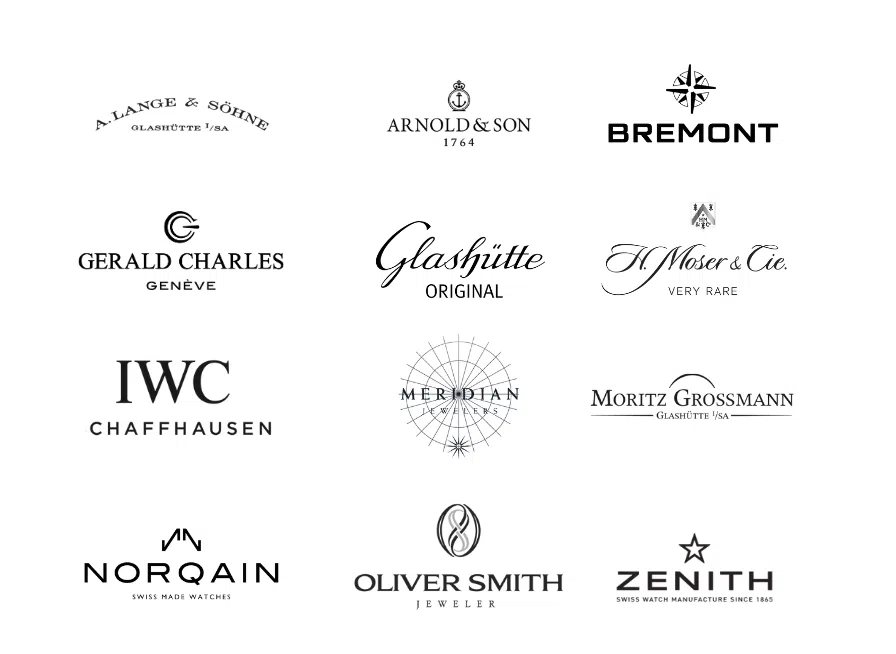 A. Lange & Söhne, Arnold & Son, Bremont, Gerald Charles, Glashütte Original, H. Moser & Cie., IWC, Meridian Jewelers, Moritz Grossmann, Norqain, Oliver Smith Jeweler, and Zenith.