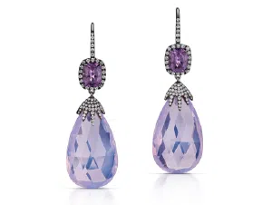 These unique designer earrings offer a doubly impactful Valentine’s Day gift, as the diamond and lavender quartz drops can be removed from the top of the earrings so the spinel and diamond halos can be worn alone.