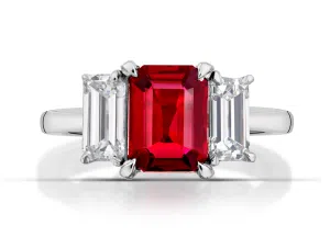 Stephen Silver presents a head-turning three-stone ring featuring an incredible 1.86 carat Mozambique ruby. The deep red gem is flanked by two emerald cut diamonds with a collective total weight of approximately 1.00 carats, set in platinum.