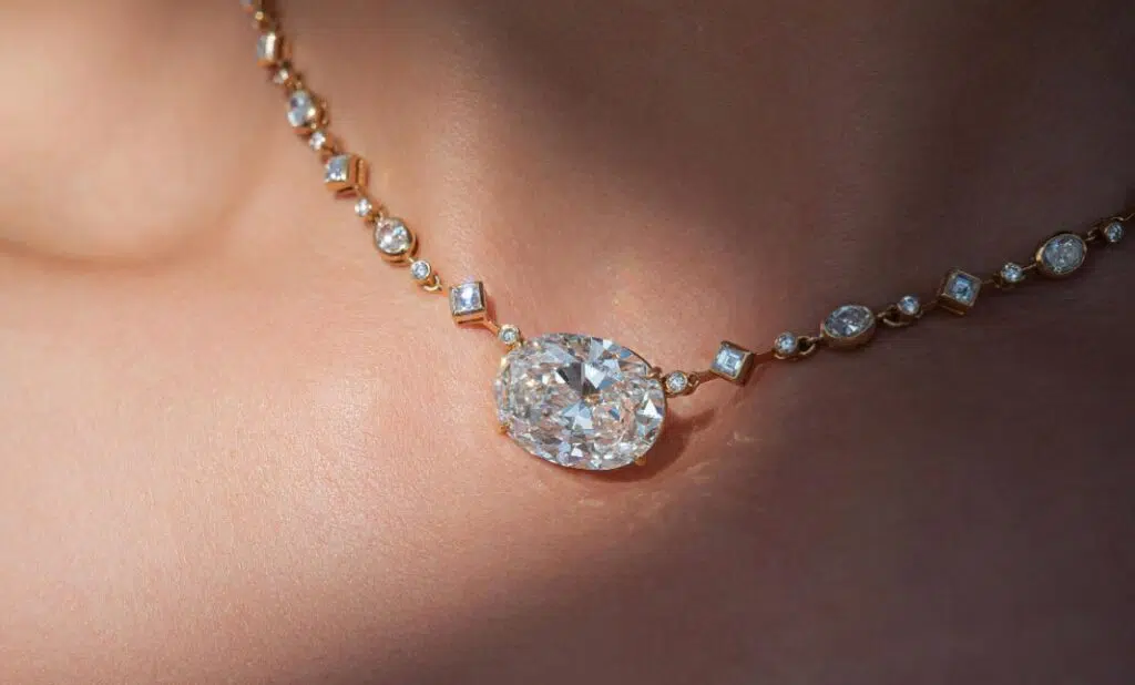 The 18-karat yellow gold adds yet more subtle allure with its links of mixed-cut diamonds, including carré cut (1.9 carats), round brilliant cut (0.42 carats), and oval cuts (3.15 carats). Altogether, this incredible necklace accounts for a total of 14.75 carats in natural diamonds.