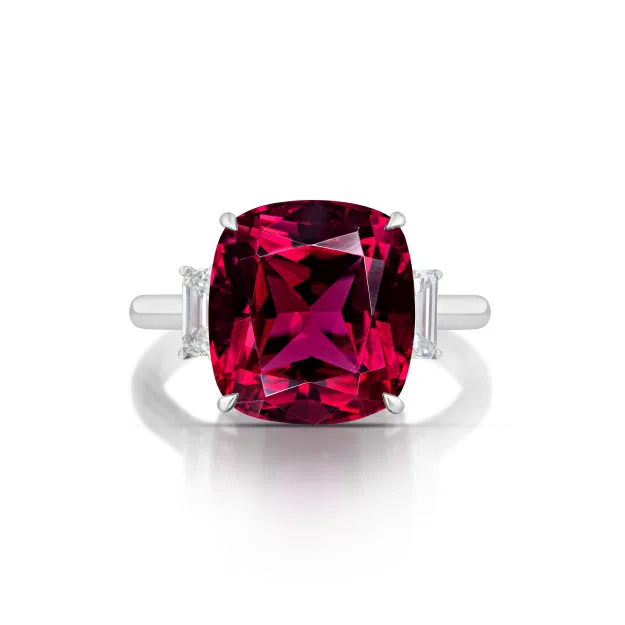 The 7.00 carat rubellite tourmaline is the remarkable focal point of this three-stone ring, flanked by 0.64 emerald cut diamonds.