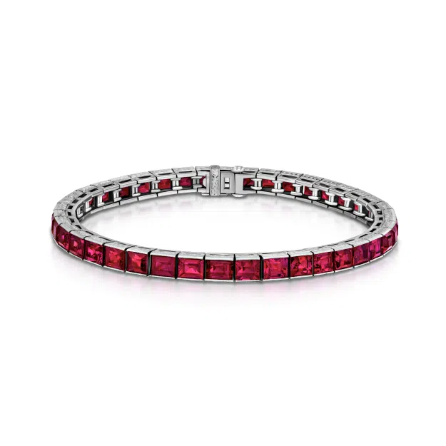 Stephen Silver’s Burmese ruby line bracelet is a celebration of pure, rich, radiant color. Minimalist in line yet extravagant in color, this platinum line bracelet features a jaw-dropping 14.00 carats of rectangular step-cut Burmese rubies.