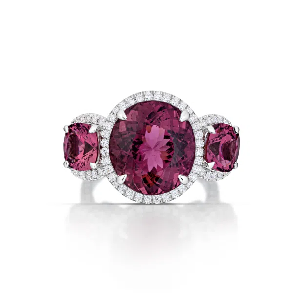 Classic elegance meets fiery scintillation in this rubellite tourmaline and diamond three-stone ring from Stephen Silver.