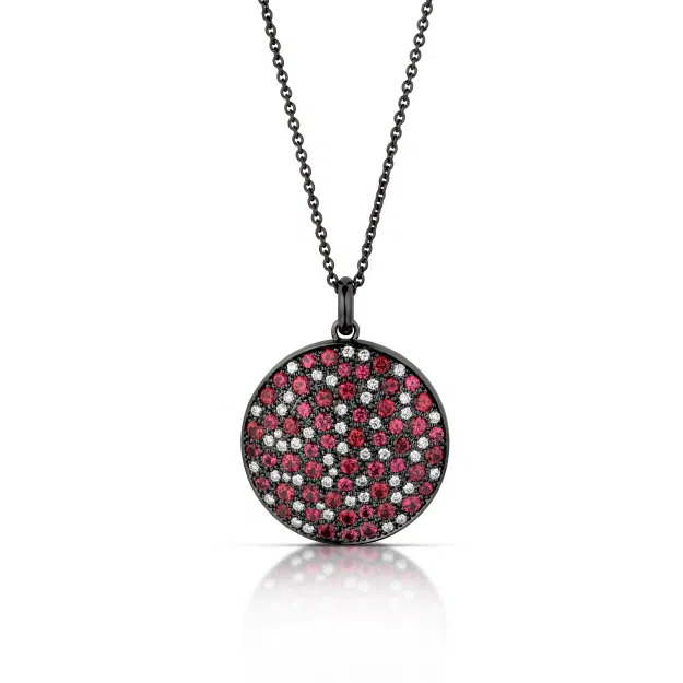 The round blackened rhodium and white gold pendant features 3.14 carats of round brilliant cut Burmese spinel gems and 0.70 total carats of round brilliant cut diamonds.