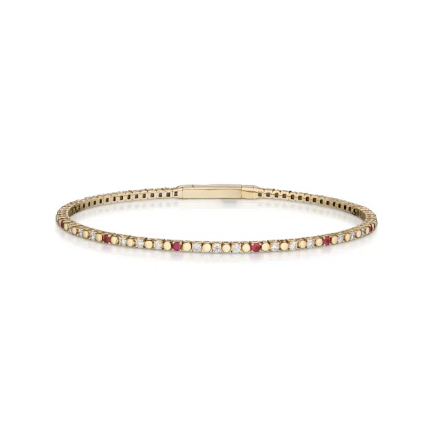 This sophisticated flexible diamond and ruby bangle bracelet from Stephen Silver plays on the power of simple pattern with repeating round gemstone and gold elements, composed of 0.24 carat of round brilliant cut rubies, 0.72 total carats of sparkling diamonds, and high polished 14 karat yellow gold elements.