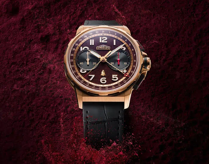 La Chaux-de-Fonds, Switzerland (June 29, 2023) – To mark its first appearance in the Only Watch charity auction, Swiss watchmaker Angelus has chosen to play on its name and partner with one of the greatest Bordeaux winemakers. Together, Angelus and Château Angelus have created a one-of-a-kind watch, the Chronodate Gold x Château Angelus, featuring a remarkable dial crafted with freeze-dried lees from the elite winemaker’s 2022 vintage. Their shared name presents more than just an opportunity because passion, collection, perpetuation, and patience are at work in the creation of both a watch and a great wine. The Only Watch auction lot also includes a prestigious “Impériale” from the 2012 vintage and a few bottles of the Château’s very rare Grand Vin Blanc, proceeds from which will raise funds for Duchenne muscular dystrophy research.