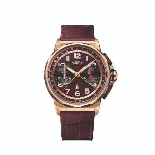 A chronograph movement was chosen as a reference to the brand’s historical roots, since Angelus was a first-rate manufacturer of these pieces from the late 1930s onwards. Inside Chronodate Gold x Château Angelus is the A-500 in-house calibre. Its design features the small seconds at 9 o’clock and a 30-minute chronograph counter at 3 o’clock. A hand-based date display also sweeps around the dial and recalls the first Chronodate model from 1942.