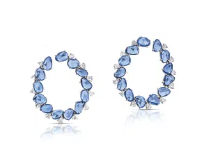 Old meets new in these sculptural and elegant front-facing hoop-style sapphire earrings from Stephen Silver. The dazzling array of rose-cut blue sapphires offers a nod to the past with a favorite heirloom gem cut (18.79 carats in total), presented in an asymmetrical hoop form that is wholly modern.