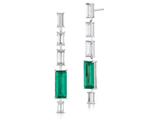 Spare, elegant, and contemporary – with a ring of Art Deco modernity – these elegant emerald and diamond earrings from Stephen Silver feature a stunning pair of baguette cut “Muzo Green” Colombian emeralds.