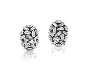 Often employed as a complementary gem cut, here, the baguette cut diamond takes center stage. Silver created these edgy yet classic oval-shaped baguette diamond cluster stud earrings as a showcase for the underrated diamond shape.